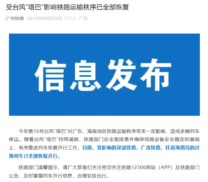 CCTV新闻:根据“广州铁路”的官方帐户,今年的第16号台风“脂肪”为通往广东和海南的火车运输命令带来了确定性。 CCTV新闻:根据“广州铁路”的官方说法,今年的16号风暴“脂肪”对广东和海南的火车运输秩序产生了一定的影响,这导致许多火车被暂停。尽管台风“脂肪”继续削弱,但铁路部门根据全面的调查适当促进了火车的延续,并确保了线路设备的安全性和稳定性。目前,所有人都影响了深圳Zhan的铁路,广玛铁路和往返海南岛的跨海火车继续运营。 喜欢 (0) or 分享 (0)