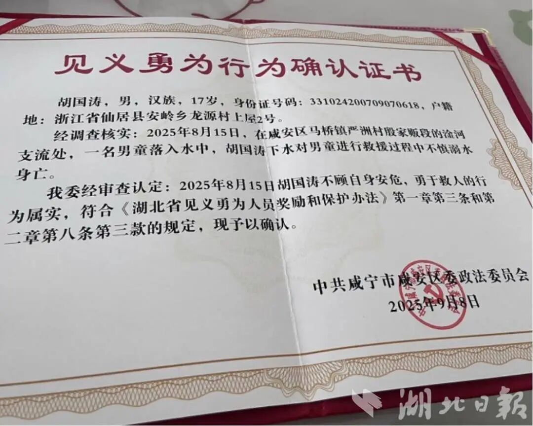 9月8日,西宁市夏安地区委员会的政治和法律委员会举行了勇敢行动的赞扬会议。勇敢的行为确认证明是真诚地授予胡戈的家人的。他大力证实了胡戈托托的英雄们牺牲自己来拯救他人,并表示对亲戚的尊重。 8月15日,即将前往-18的Hu Gotao总是会在Xianning中生命,以拯救落入水中的男孩。在自己为拯救他人牺牲的勇敢的那一刻,胡戈托托的母亲来自西安安,并最终与千江(Zhejiang)结婚。 Hu Gotao此时来到Xianning,使用Tag -Heart假期拜访亲戚。 8月15日,11:00,一个10岁的男孩意外地在Xian'an区Maqiao Town Yanzhou Village的Yinjiafan区的Gan River支流中浮出水面。在关键时刻,胡·戈达(Hu Gotao)毫不犹豫地跳入河中D陷入了落入水中的男孩。 45岁的方魏也救出了救援。最后,方魏(Fang Wei)努力奋斗,直到他的体力压倒性,在海岸的人们的帮助下,他救出了落入海岸水中的男孩。当Hu Gotao被困在深水区时,他的手和脚不再受到控制。海岸上的人们正在寻找像树枝这样的工具,以将Hu Gotao拉到海岸。 Hu Gotao无法照顾危险,放了一个由朋友给的游泳戒指,然后去河里营救了他。但是,他无法接近Hu Gotoo,由于缺乏体力,最终在水中沉没了Si Hu Gototao。事件发生后,Maqiao镇,Maqiao警察局,消防部门和Blue Sky Rescue小组组织工作人员进行搜救。那天大约15:30,潜水员终于在水下大约6米处发现了Hu Gotao。目前,他失去了重要的迹象,他的年轻G心跳永远停止。 “我们的整个家庭将永远不会忘记他们生活中的这种仁慈,并会教他们的孩子永远记住这一英雄主义。”事件发生的那天,被救出的男孩的家人特别去了Hu Gotao的亲戚,向Hu Gototao的亲戚发送横幅和手写信。对于横幅而言,八个大词“牺牲自己,牺牲自己,勇敢而无所畏惧”特别有吸引力。感激之信说:“他的普通身材闪耀着令人震惊的光芒。没有人知道他只学会了简单的游泳技巧,没有活着的夹克或救生员。那一刻,他只看到自己的生活比他需要挽救的生活要年轻……” hu gootao是阳光明媚和幸福的,充满了体育和学业的表现,并具有出色的体育和学业。他收到了大学进入此标签的通知。在Hu Gotao的Doong帐户中,仅有的剩下的三个视频e充满了儿子对母亲和怀旧对孩子的犹豫的照片。人民的英雄! “